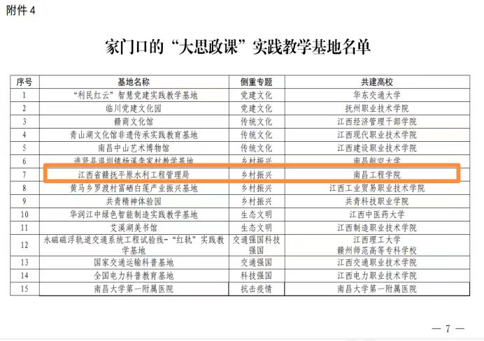 近日,根据省教育厅《关于公布“大思政课”建设综合改革试验区改革项目立项名单的通知》公布的立项结果,我校马克思主义学院申报的“江西省赣抚平原水利工程管理局”获批立项为省级“家门口的‘大思政课’实践教学基地”。