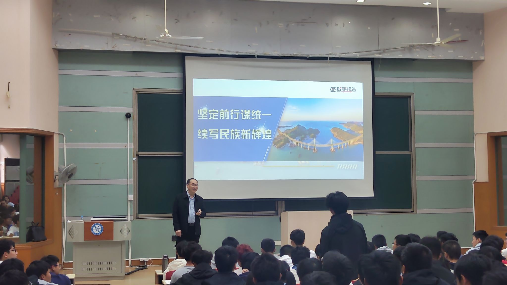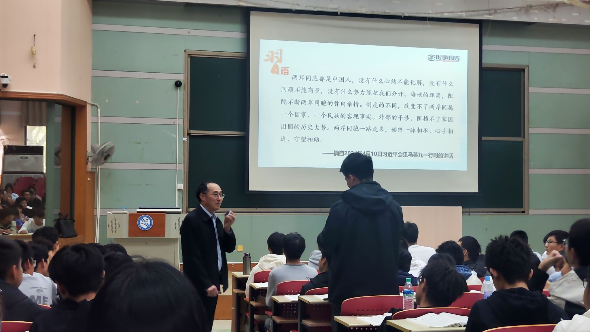 刘祖文以“坚定前行谋统一,续写民族新辉煌”为主题,分别从立足长远、全面把握两岸关系的战略考量,阐述这一关系的复杂性与敏感性;针对“台独”分裂势力的图谋,明确指出其违背历史潮流、注定失败的命运;强调坚定不移推进祖国统一大业的重要性与紧迫性,以及这一进程对于实现中华民族伟大复兴的深远意义三个部分进行讲授,并巧妙融入“联合利剑-2024B”军事演习、中国人民解放军火箭军成功在太平洋相关公海海域发射携载训练模拟弹头的洲际弹道导弹等最新时事案例,从宏观视角出发,深刻剖析了当前国内外形势,尤其是台湾问题的历史经纬与现实挑战。