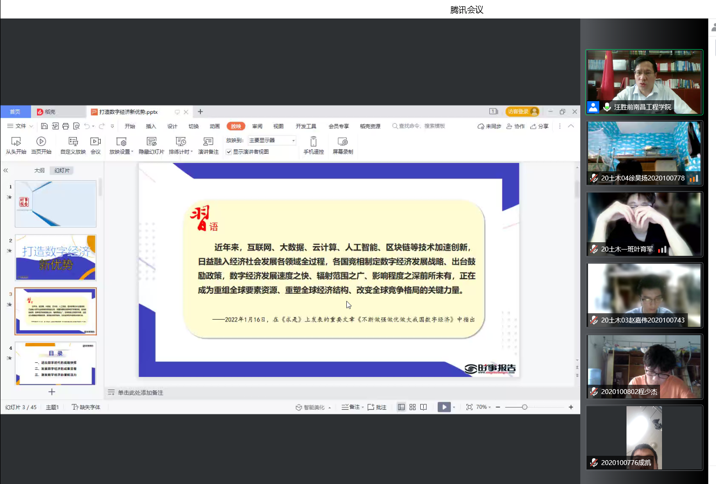 4月26日下午,校党委副书记、校长汪胜前通过腾讯会议为土木与建筑工程学院2020级土木工程1—4班学生讲授题为“打造数字经济新优势”的形势与政策思想政治理论课。