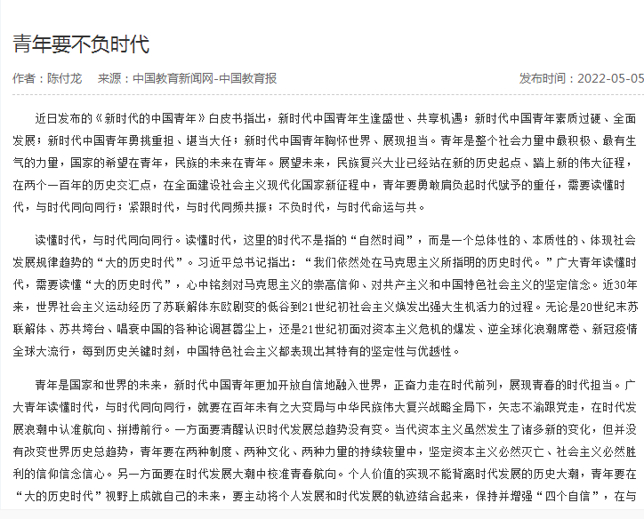 5月5日,《中国教育报》“理论周刊”栏目刊发我校马克思主义学院陈付龙教授的理论文章《青年要不负时代》。文章提出,青年是整个社会力量中最积极、最有生气的力量,国家的希望在青年,民族的未来在青年。展望未来,民族复兴大业已经站在新的历史起点、踏上新的伟大征程,在两个一百年的历史交汇点,在全面建设社会主义现代化国家新征程中,青年要勇敢肩负起时代赋予的重任,读懂时代,与时代同向同行;紧跟时代,与时代同频共振;不负时代,与时代命运与共。(文/图 罗小松)