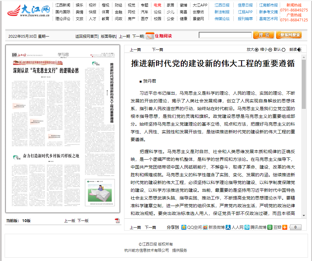 5月30日,《江西日报》理论版刊登校党委委员、副校长贺丹君的理论文章《推进新时代党的建设新的伟大工程的重要遵循》。文章指出,马克思主义是我们立党立国的根本指导思想,是我们党的灵魂和旗帜,政党建设思想是马克思主义的重要组成部分。始终坚持马克思主义党建理论的基本立场、观点和方法,把握好马克思主义的科学性、人民性、实践性和发展开放性,是继续推进新时代党的建设新的伟大工程的重要遵循。(文/图 罗小松)