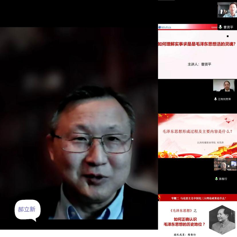 马克思主义学院曹贤平、江西传媒职业学院刘芳萍、江西生物科技职业学院陈智行等三位老师分别就“如何理解实事求是是毛泽东思想活的灵魂?”“毛泽东思想形成过程及主要内容是什么?”“如何正确认识毛泽东思想?”三个主题内容进行教学展示,讲授了马克思主义中国化的第一次历史性飞跃的相关问题。