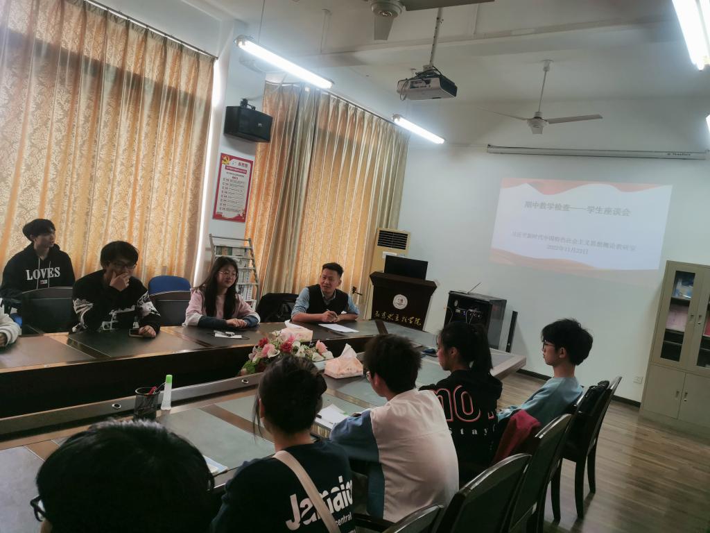 为规范教学管理,提升教学质量,及时发现和解决教学工作中存在的问题,11月23日中午马克思主义学院在南A400会议室召开了《习近平新时代中国特色社会主义思想概论》课程期中教学检查学生座谈会。会议由《习近平新时代中国特色社会主义思想概论》教研室主任曹贤平主持,30余名师生参会。