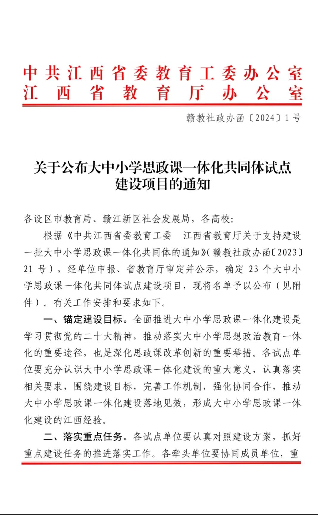 近日,中共江西省委教育工委、江西省教育厅发布了《关于公布大中小学思政课一体化共同体试点建设项目的通知》,我校牵头组建的“大中小学思政课一体化共同体”成功入选省级建设名单。
