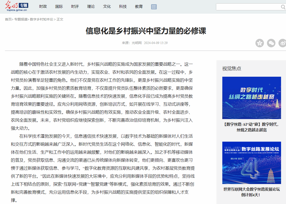 近日,我校马克思主义学院教师陈娇云在光明网发表理论文章《信息化是乡村振兴中坚力量的必修课》。