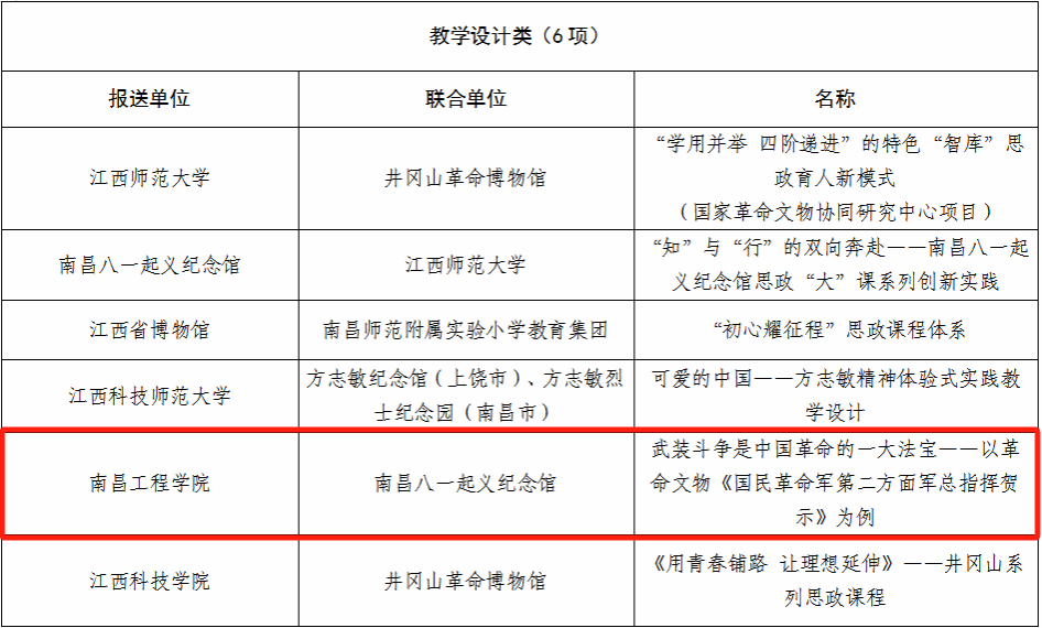 7月,江西省文化和旅游厅、江西省教育厅公布了革命文物为主题的“大思政课”优质资源项目名单,我校马克思主义学院与南昌八一起义纪念馆联合申报的“武装斗争是中国革命的一大法宝--以革命文物《国民革命军第二方面军总指挥贺示》为例”教学设计类课程资源成功入选项目名单,这是我校首次入选江西省“大思政课”优质资源项目名单。