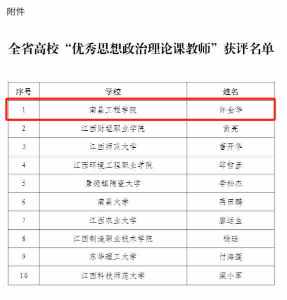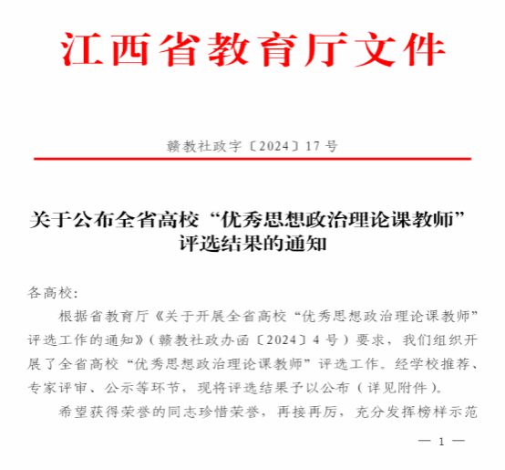 近日,江西省教育厅发布了《关于全省高校“优秀思想政治理论课教师”评选结果的通知》,我校马克思主义学院许金华老师成功获评全省高校“优秀思想政治理论课教师”。