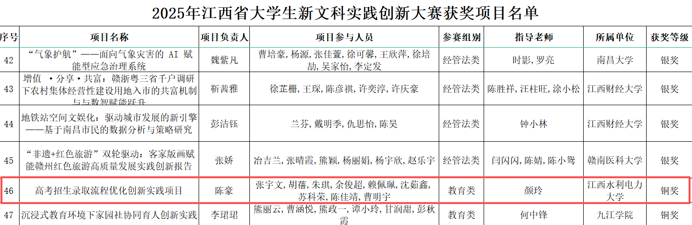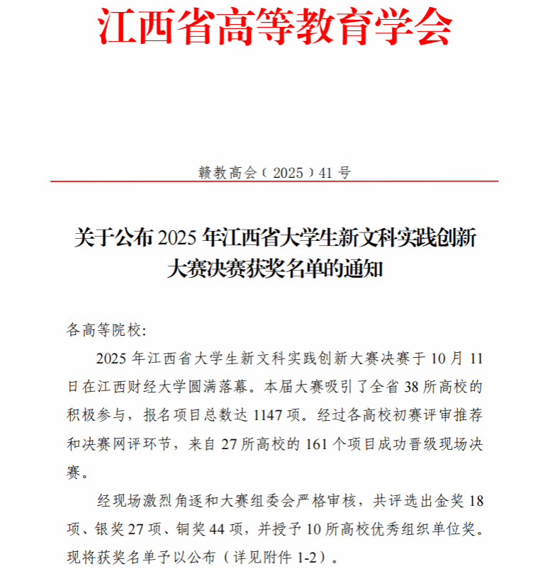 10月11日,江西省新文科实践创新大赛现场决赛在江西财经大学圆满落幕。马克思主义学院颜玲教授指导的《高考招生录取流程优化创新实践项目》团队凭借扎实的实践能力与创新思维,从全省多所高校的优秀参赛队伍中脱颖而出,成功斩获铜奖。