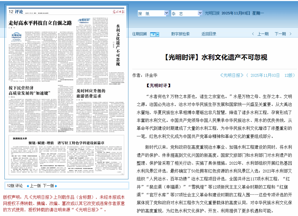 11月3日,我校马克思主义学院院长许金华教授在《光明日报》发表题为《水利文化遗产不可忽视》评论文章。