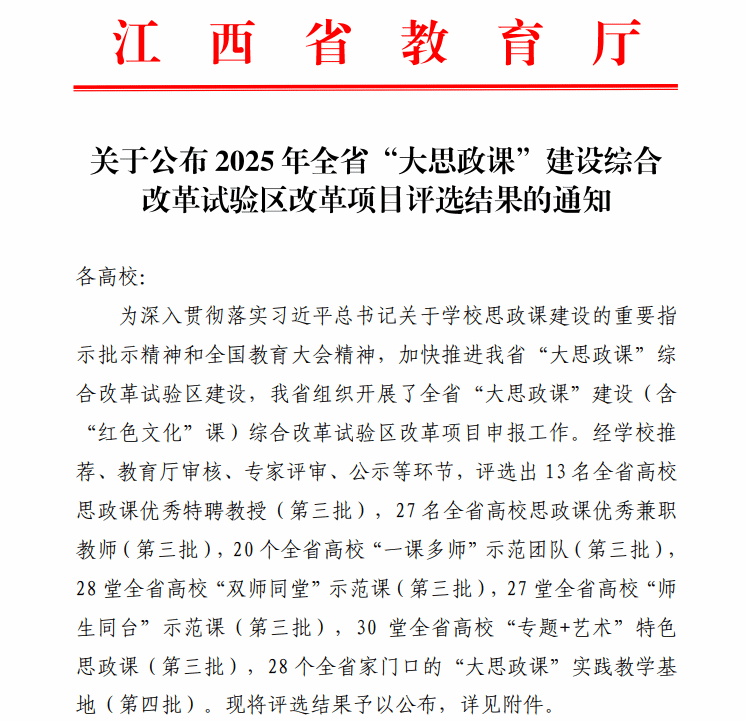 近日,江西省教育厅公布了《2025年全省“大思政课”建设综合改革试验区改革项目评选结果的通知》,我校教师在限项申报、激烈竞争中脱颖而出,再获4项荣誉,进一步彰显了我校在思政课改革创新方面的显著成效。
