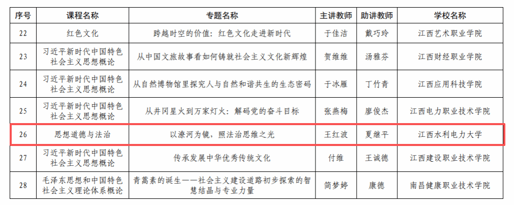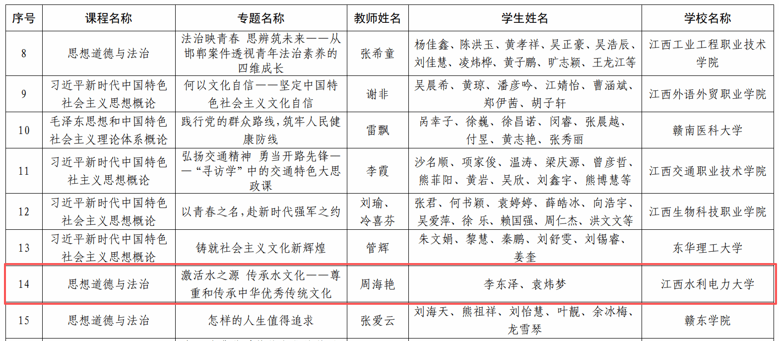 王红波老师主讲的《以潦河为镜,照法治思维之光 》获评全省高校“双师同堂”示范课,周海艳老师主讲的《激活水之源 传承水文化——尊重和传承中华优秀传统文化》获评全省高校“师生同台”示范课。同时,许金华、陈红参与的《毛泽东思想和中国特色社会主义理论体系概论》课程教学团队获评全省高校“一课多师”示范团队,王诚德参与助讲的《传承发展中华优秀传统文化》获评全省高校“双师同堂”示范课。