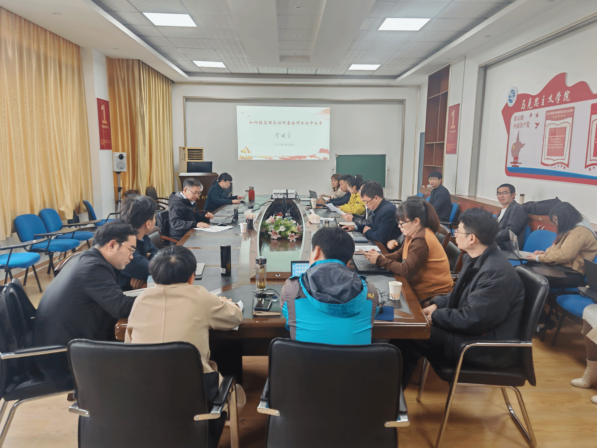 3月28日上午,浙江工商大学特聘教授、原井冈山大学校长曾建平在马克思主义学院作2025年国家社科基金申报辅导,20余位教师参加。