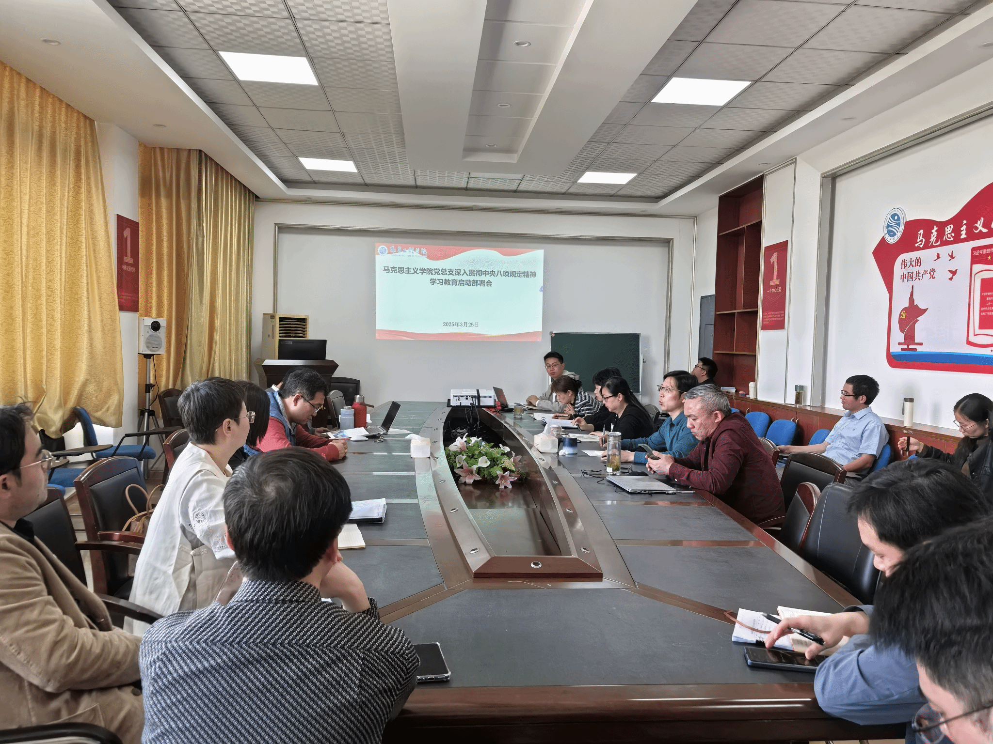 3月25日上午,马克思主义学院党总支召开会议,学习贯彻习近平总书记关于深入贯彻中央八项规定精神学习教育的重要讲话和重要指示精神,传达学习中央党的建设工作领导小组会议精神和中央办公厅有关通知精神,部署学院学习教育工作。会议由党总支书记李瑛主持,全体党员教师参会。