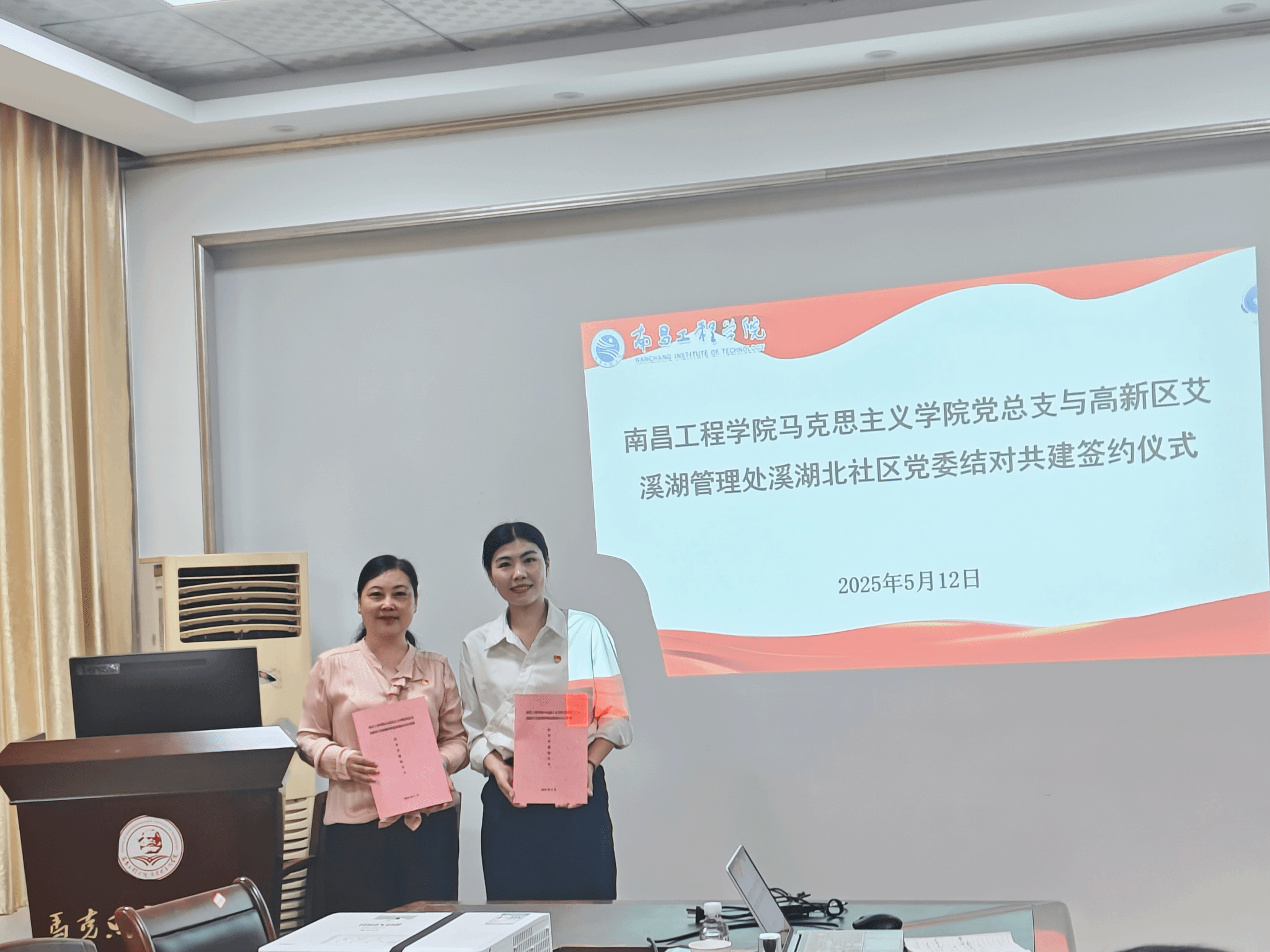 5月12日,马克思主义学院与高新区艾溪湖管理处溪湖北社区举行党建结对共建签约活动。艾溪湖管理处党群办主任章卫、溪湖北社区党委书记周晨曦和社区党务周建伟、马克思主义学院党总支班子成员及学院党支部书记、部分教师代表参加活动。